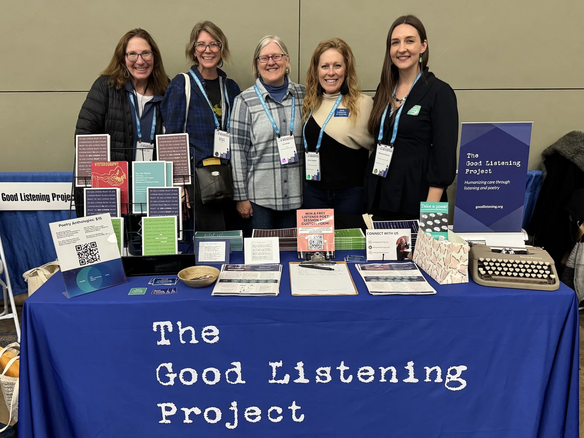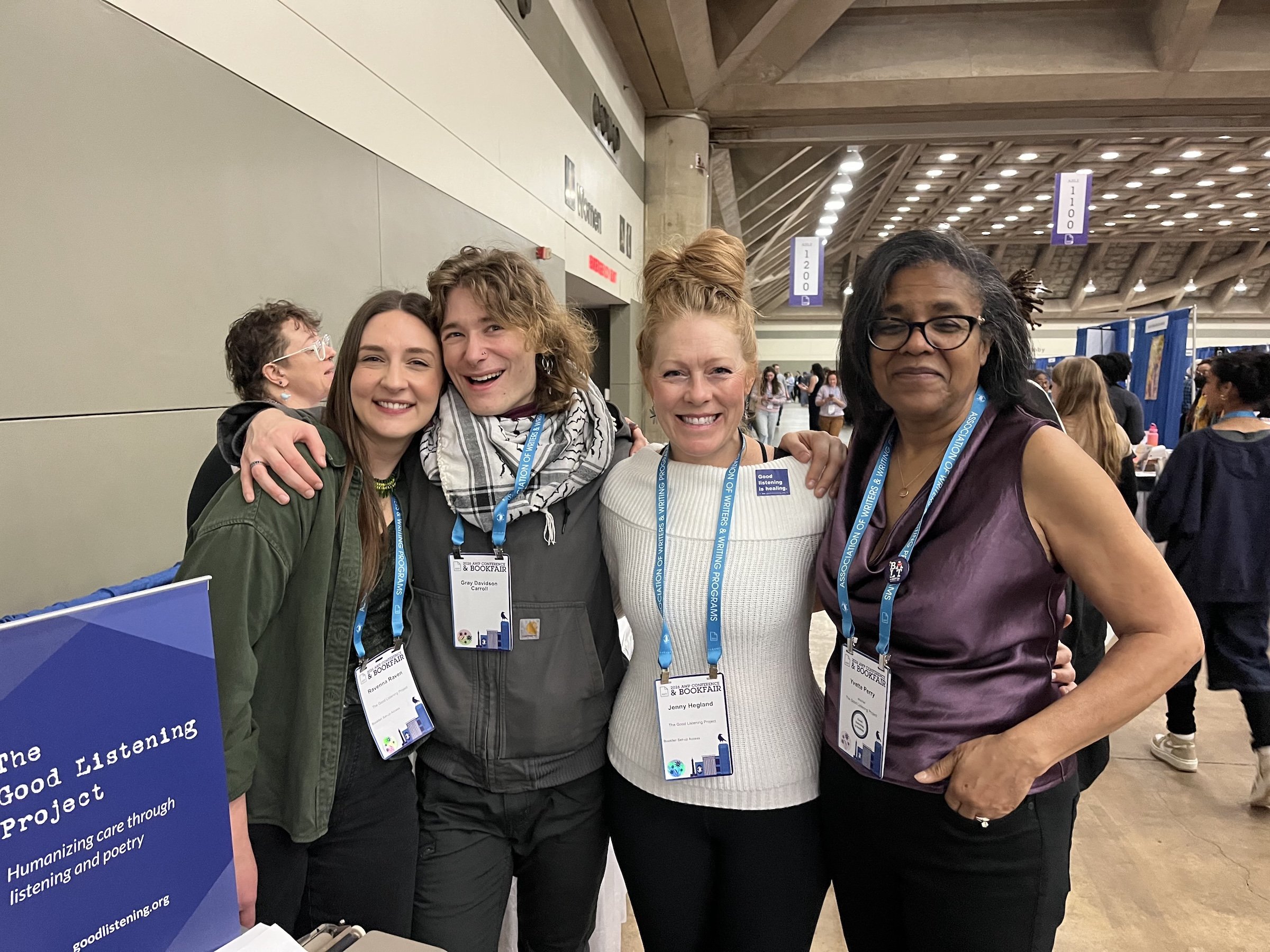 From left to right: Listener Poets Elizabeth Tan & Kelsey Mahaffey, Listener Poet & Board member Jo Linder, Executive Director Jenny Hegland, and Education & Publications lead Ravenna Raven.