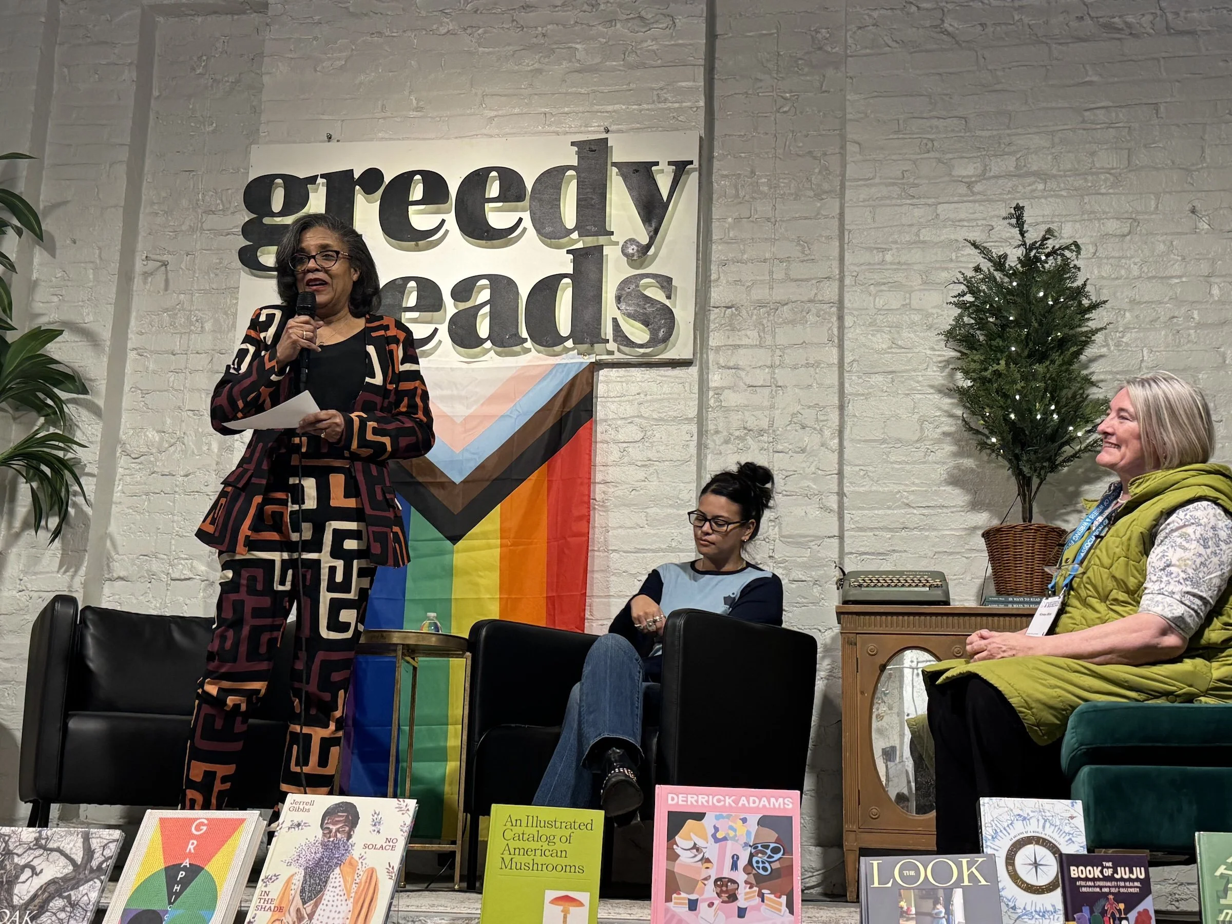 Yvette Perry, Listener Poet & Health Equity Programs lead for The Good Listening Project, reading her poem at the Tupelo Press 30/30 Alumni Reading at Greedy Reads.