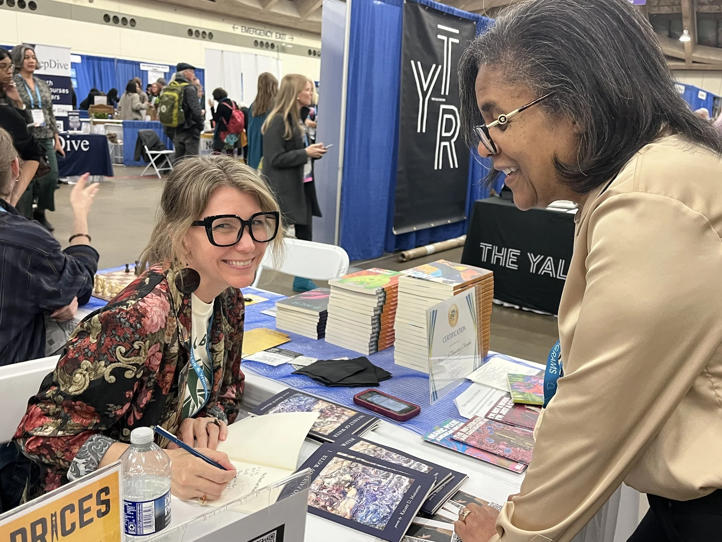 Kelsey Mahaffey signing her book, No Fault of Water, for Yvette Perry at The Pinch Journal booth.